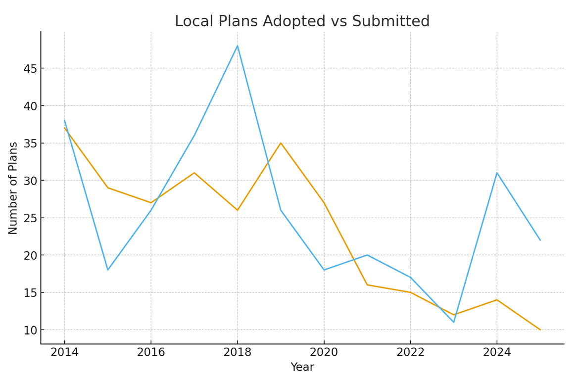 While submissions are increasing, the time taken to move from submission to adoption has deteriorated sharply. The second chart illustrates this clearly. A decade ago, around half of all examinations that reached adoption were completed in under 18 months. In the last three years, only one authority has managed to achieve that benchmark (hats off to you, West Suffolk). The current average time from submission to adoption is now approximately 37 months, double the typical timescales seen in the mid-2010s.