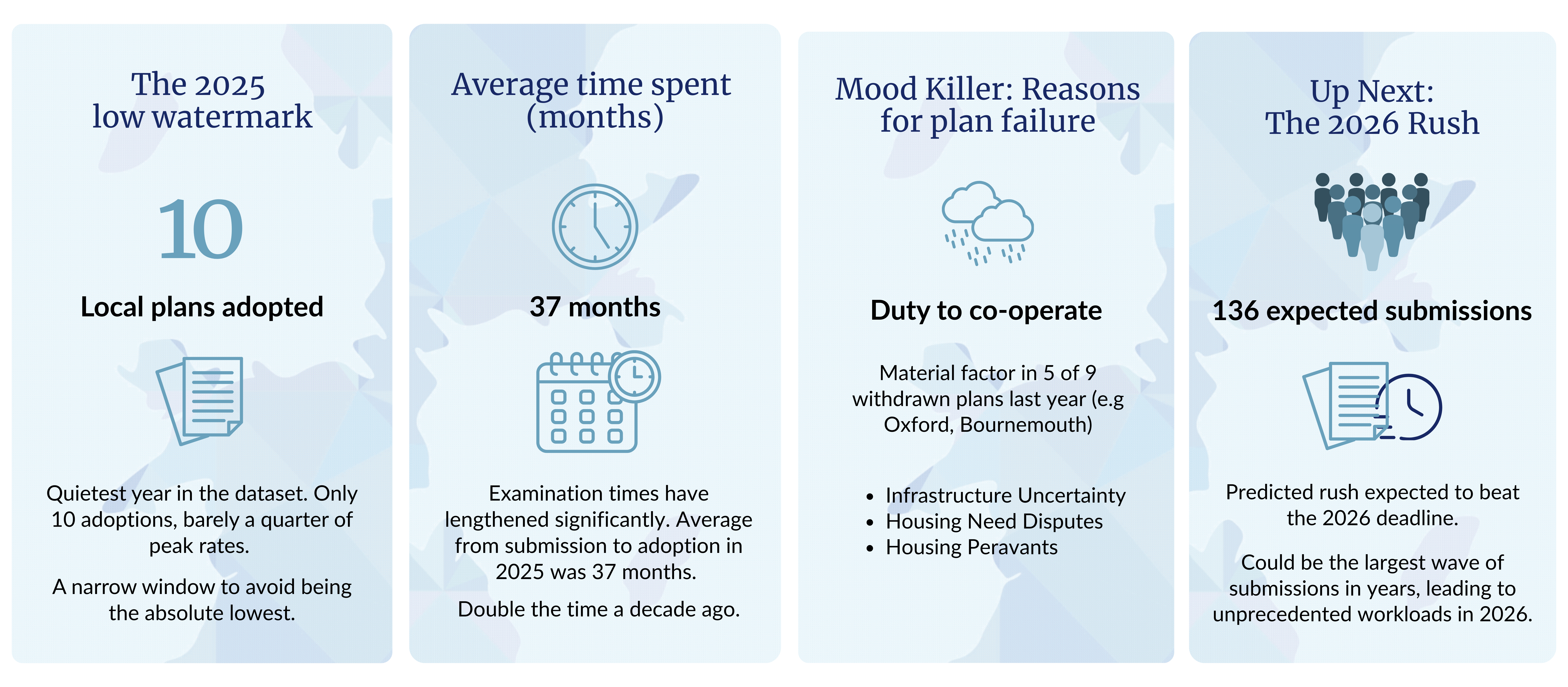 Looking at; the number of Local Plans now in the system; the many more on the way; and, the watering down of the biggest barrier to soundness coverage, it is easy to see how we could rise rapidly from the current low watermark of 24 percent Local Plan coverage nationally. How high we can go will depend on the number of plans that can be submitted before the end of 2026, when a new system is likely to cause a cliff edge of submissions, and on the robustness of these submissions. Authorities will be under severe pressure to get local plans in and this may mean not all evidence bases will be watertight. Set against this, we will have Local Plan Inspectors weighed down by huge workloads and instructed not to give authorities longer than six months to resolve any post-submission issues. Our 2026 Wrapped could paint a very different picture.