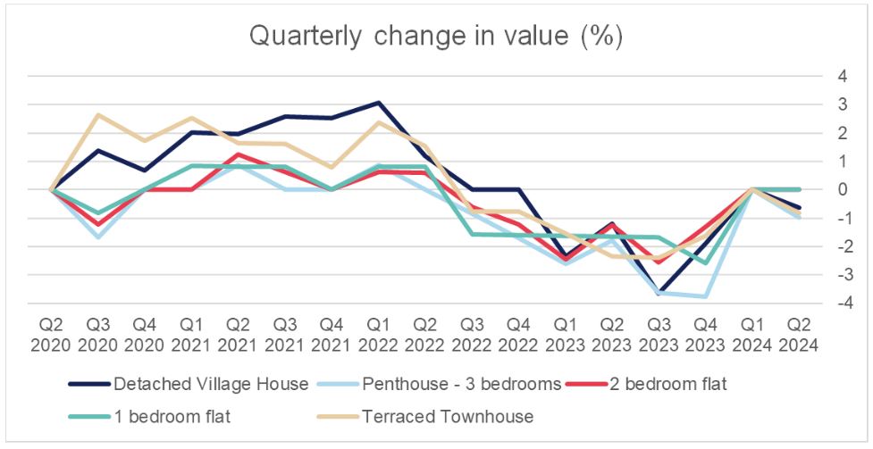 What we see over the 24 month period is that it is likely the larger homes held their value for longer, but have since dropped faster. The most volatile property type is the larger flat / penthouse, however, it is also the most scarce with the least trackable data. The smaller flats reacted first to the downturn and have slowed their decline in the last 12 months.